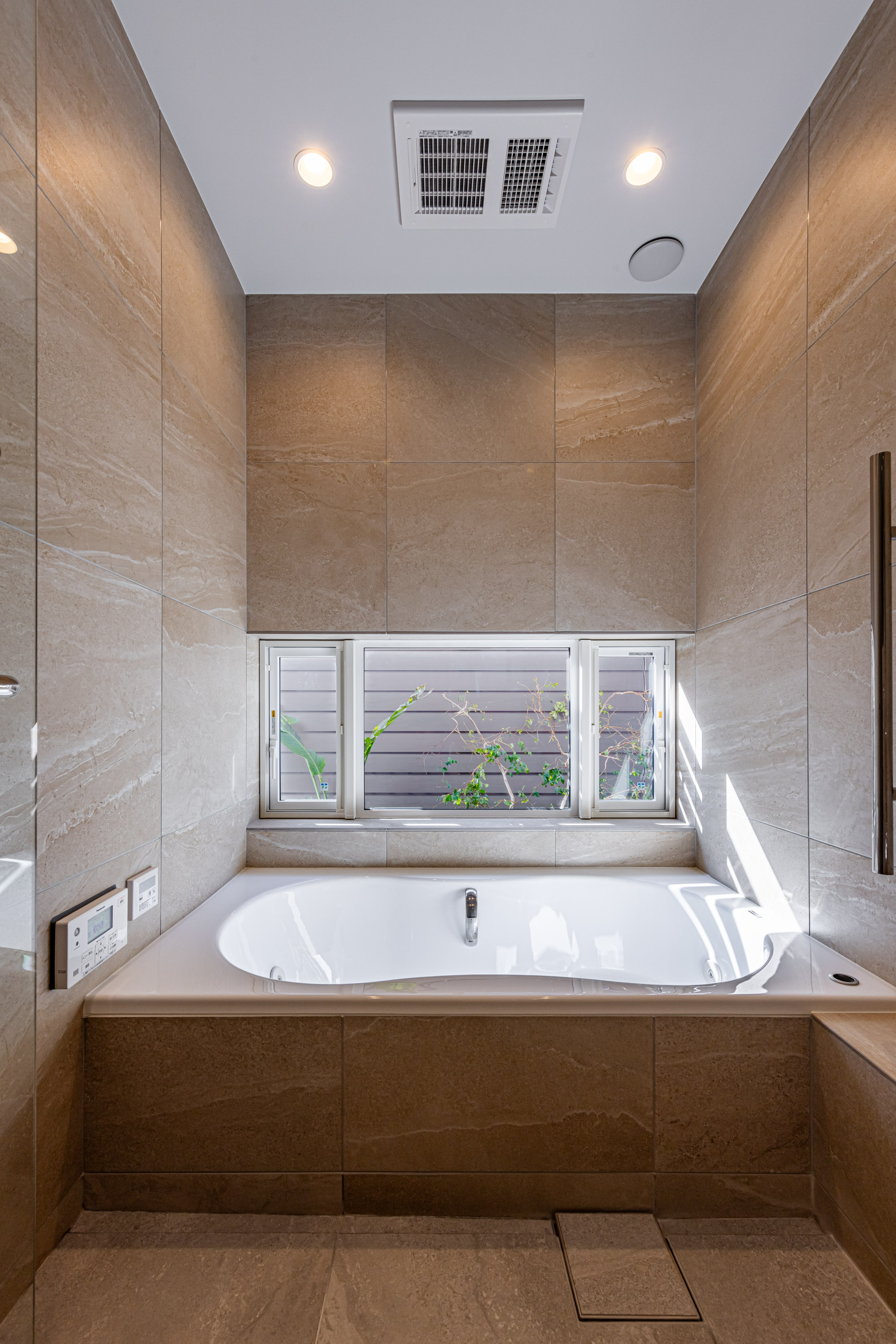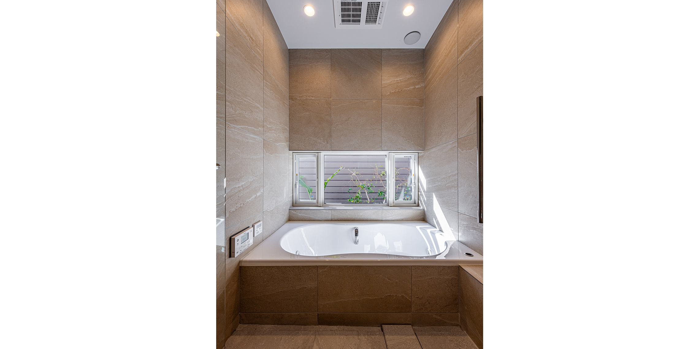 温かみのある色合いと上品な脈模様・ホテルのような大判サイズ・光の屈折・音・植物・照明によって織りなされる造形に囲まれて、忙しい日々の疲れも癒されそうです。