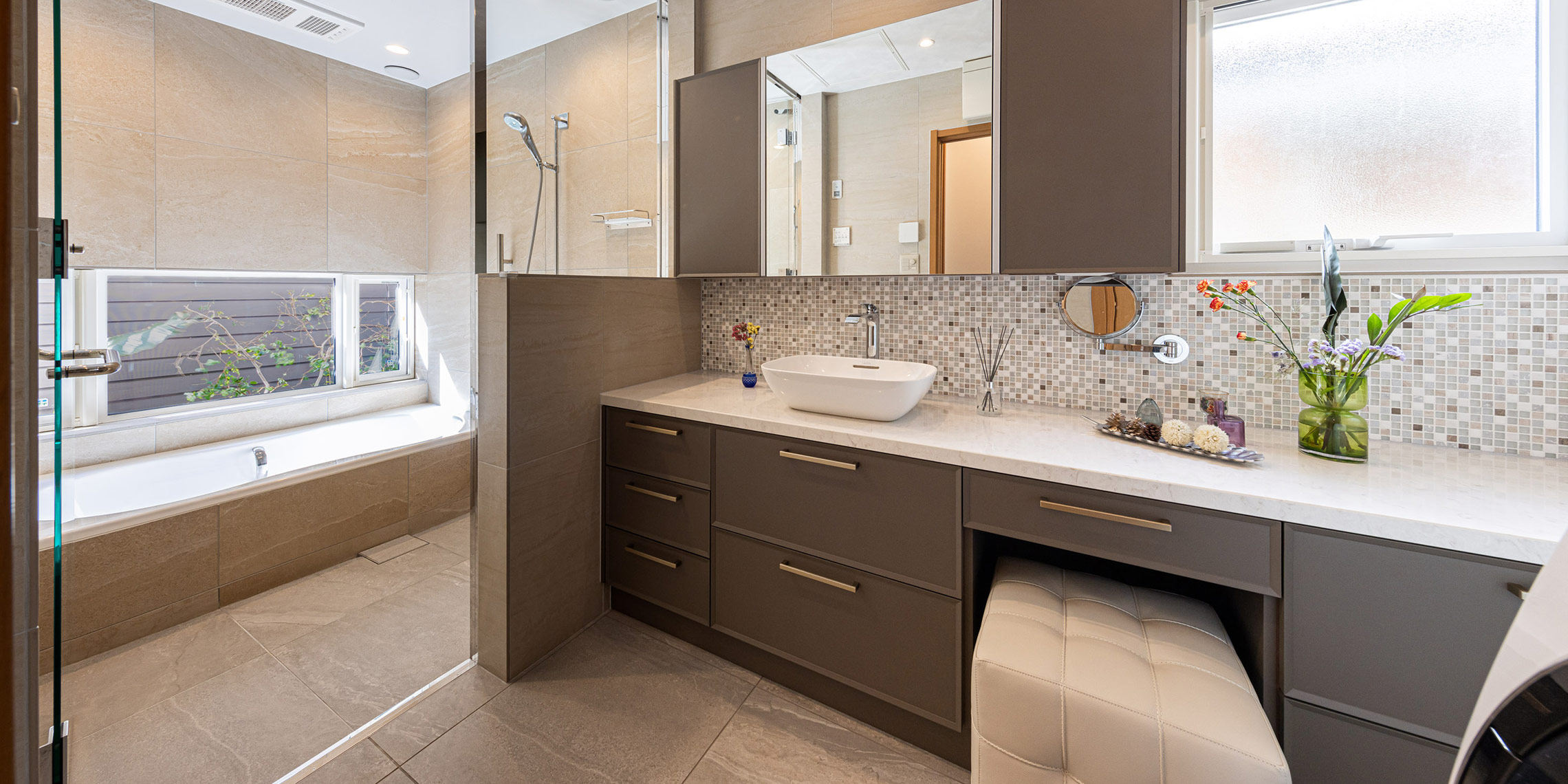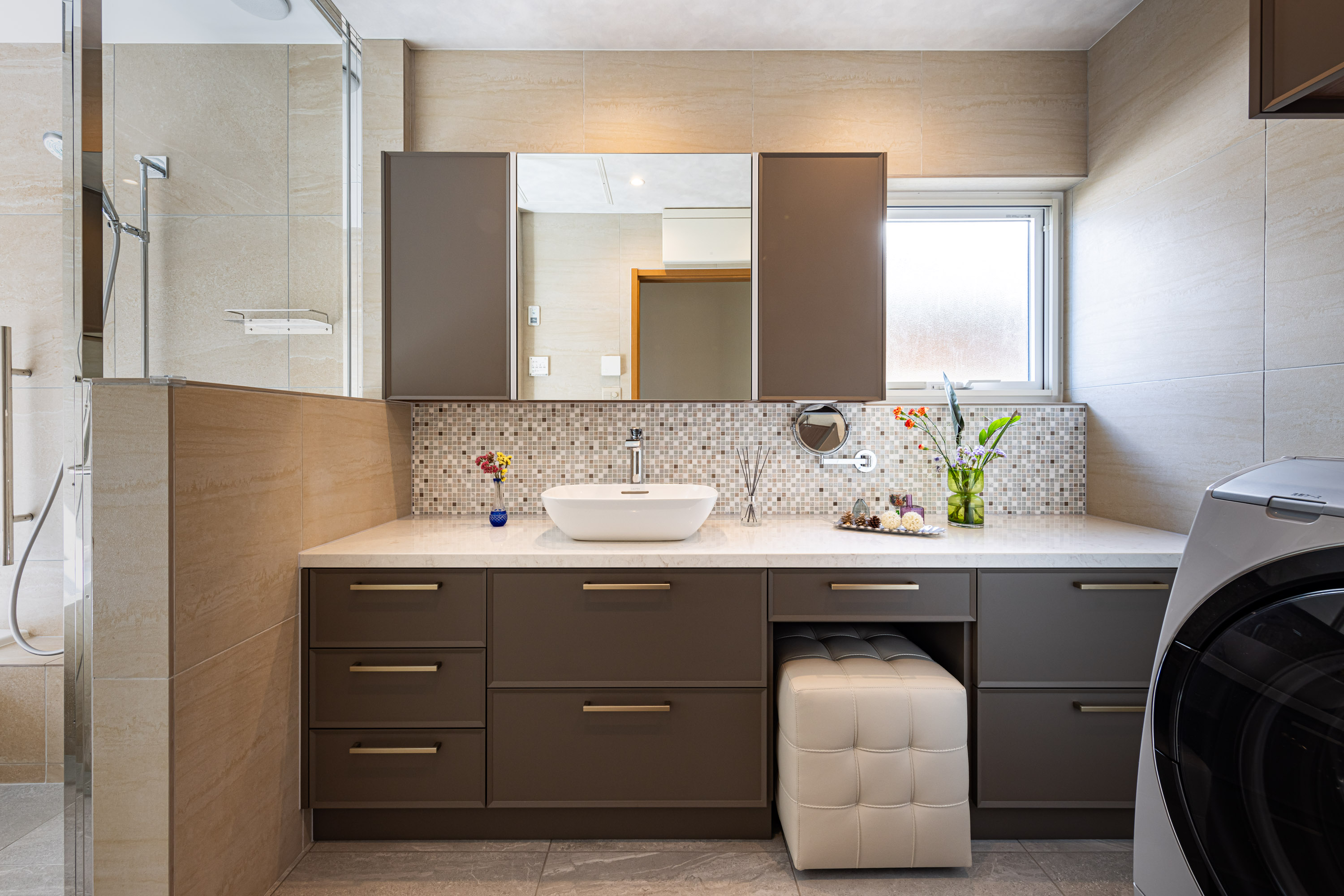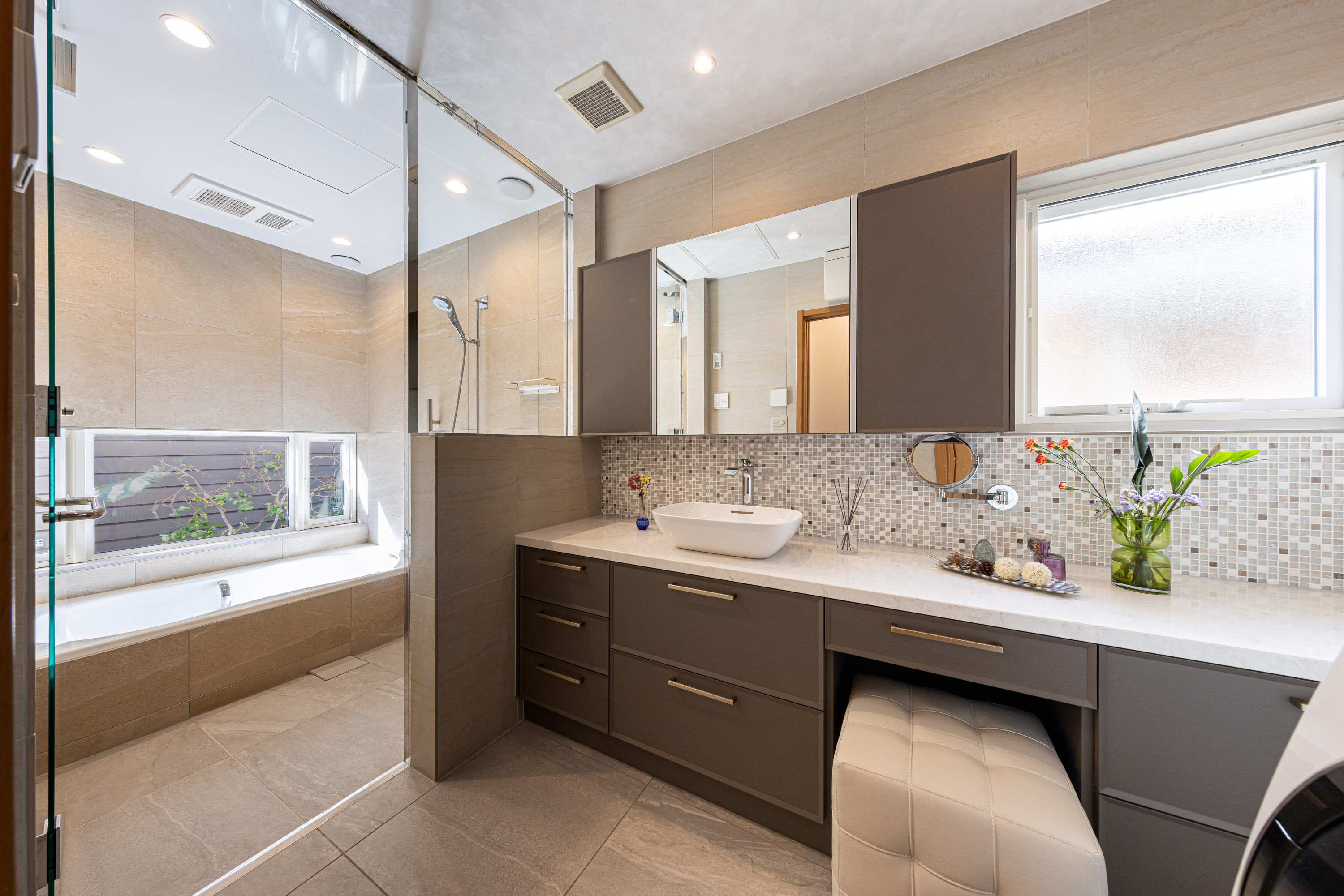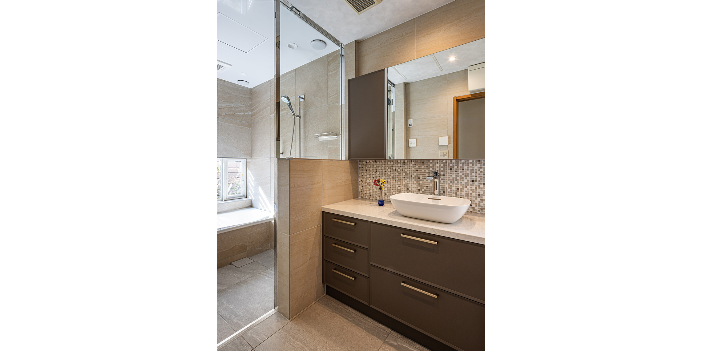 浴室の壁はアルティカ ベージュ内用60×60サイズ、床はヌーベ内用60×60サイズで空間に落ち着きと統一感を与えています。洗面の壁はカレイド ベージュの大判60×120サイズでラグジュアリーに。