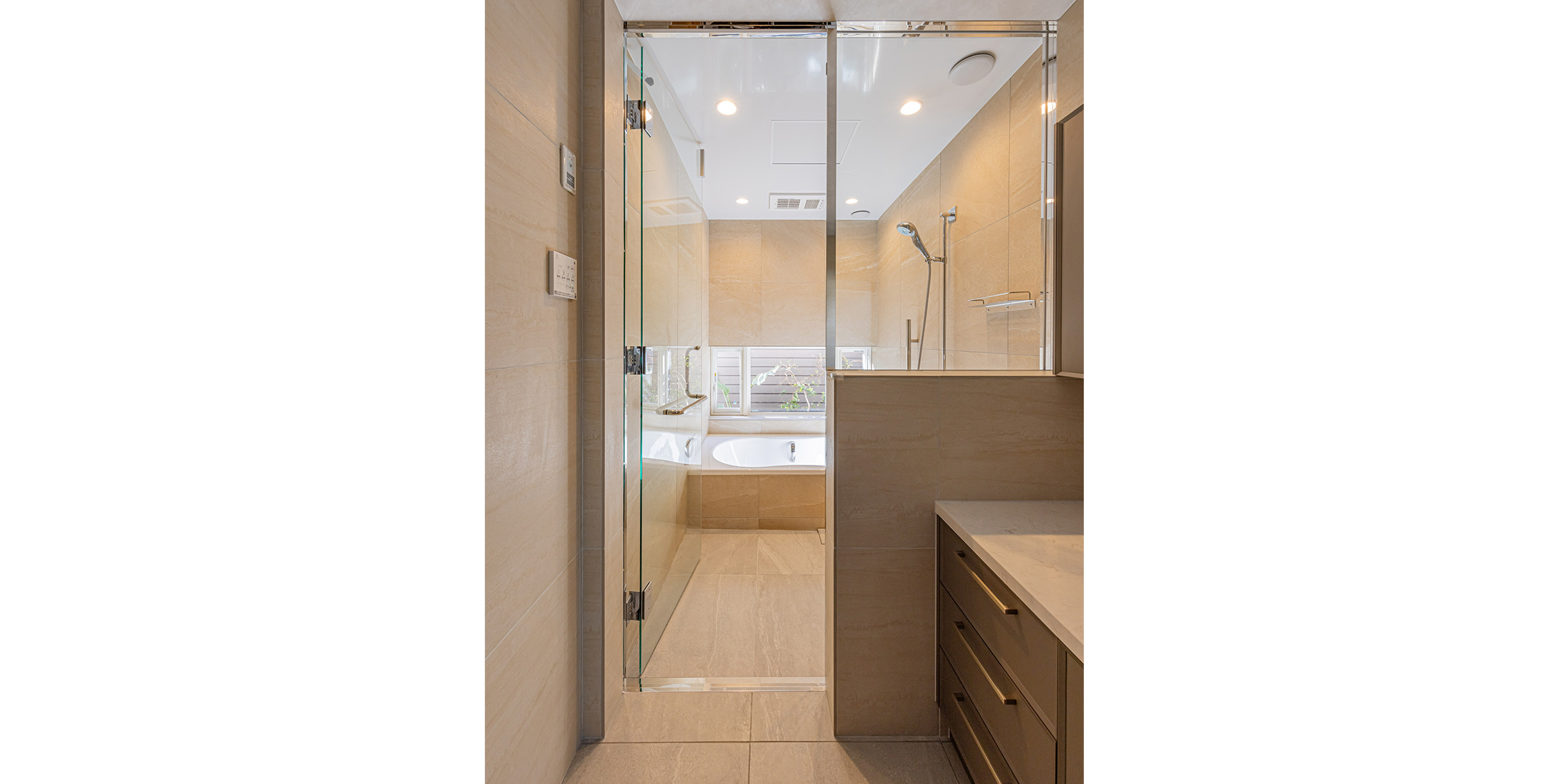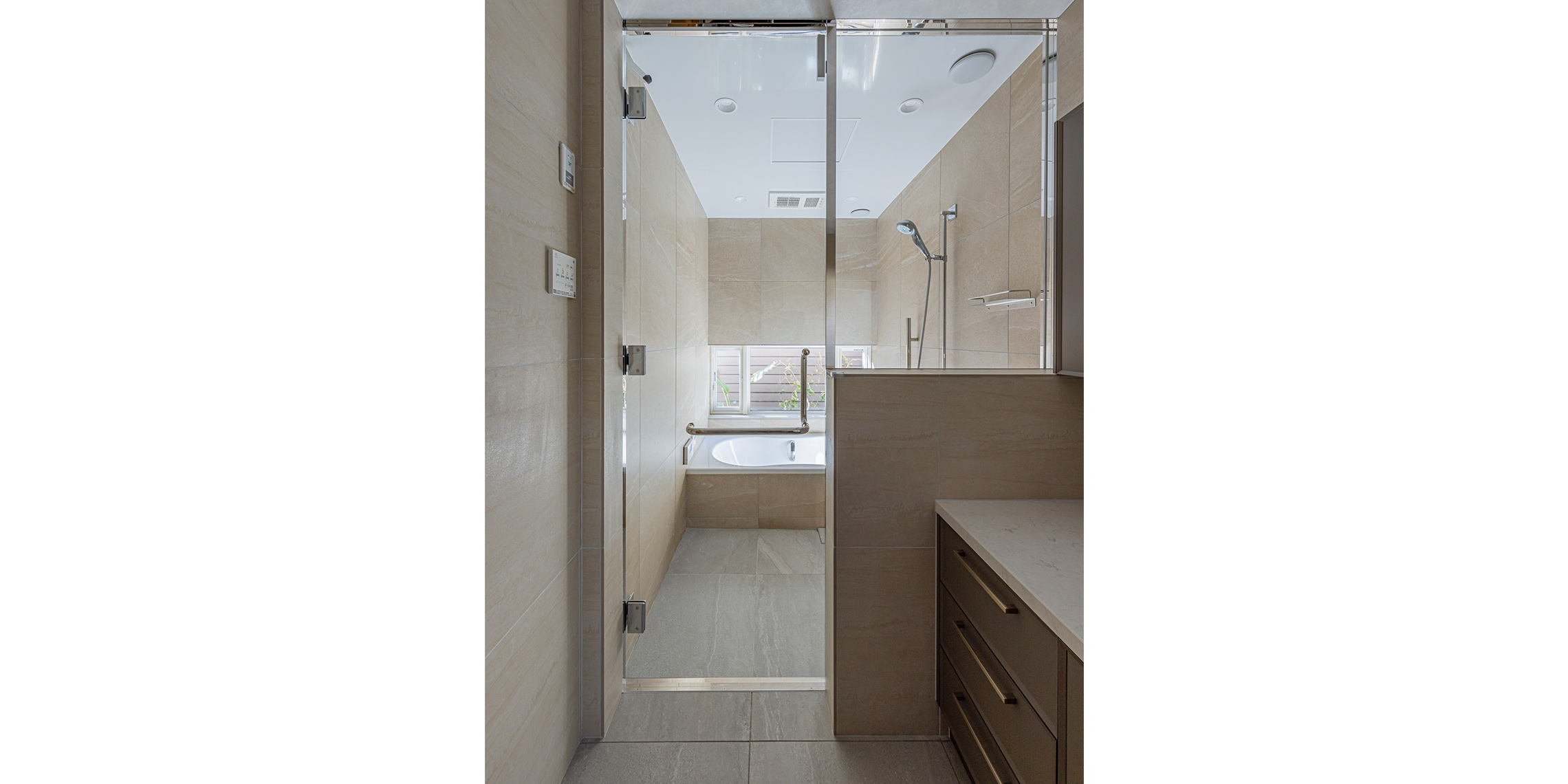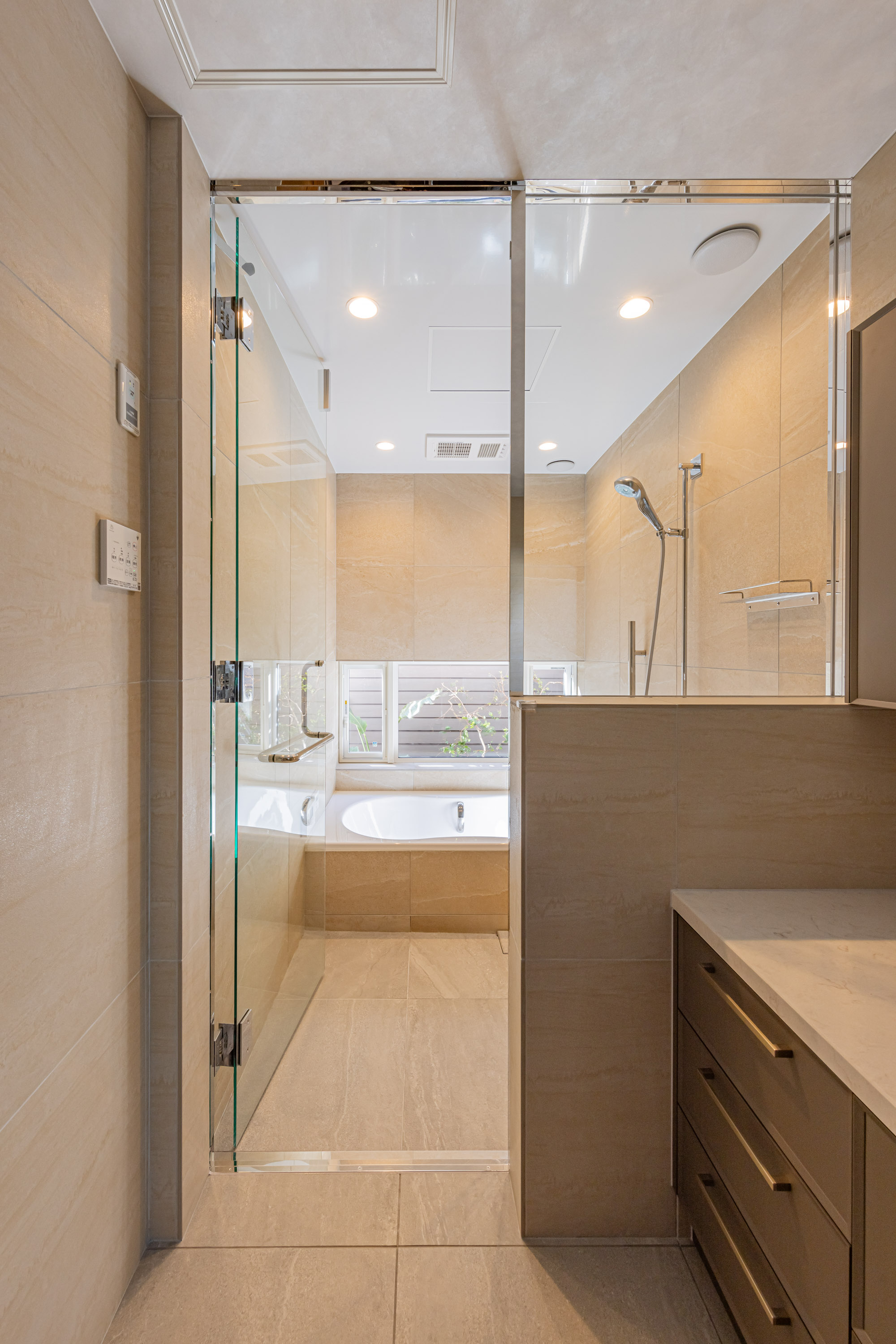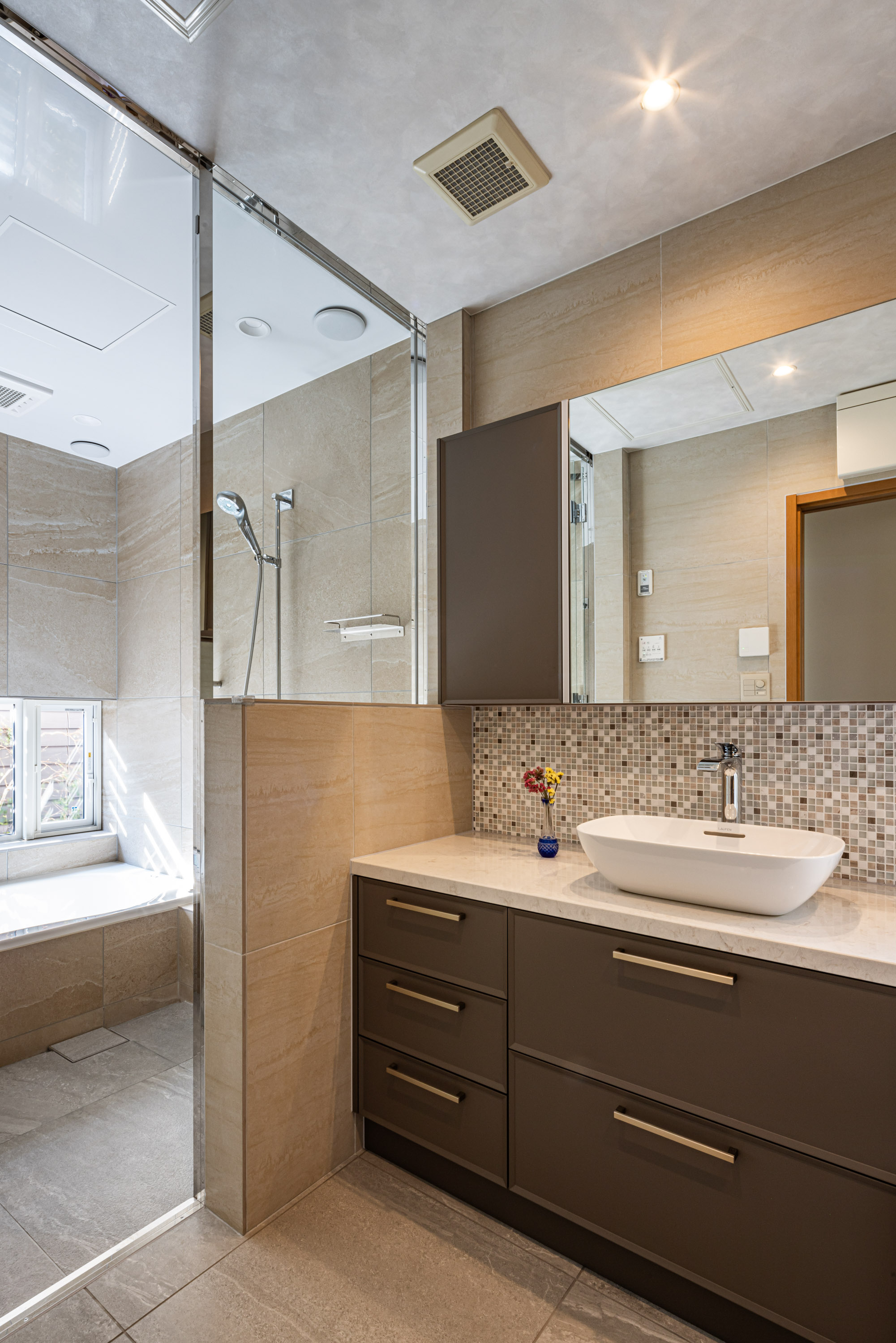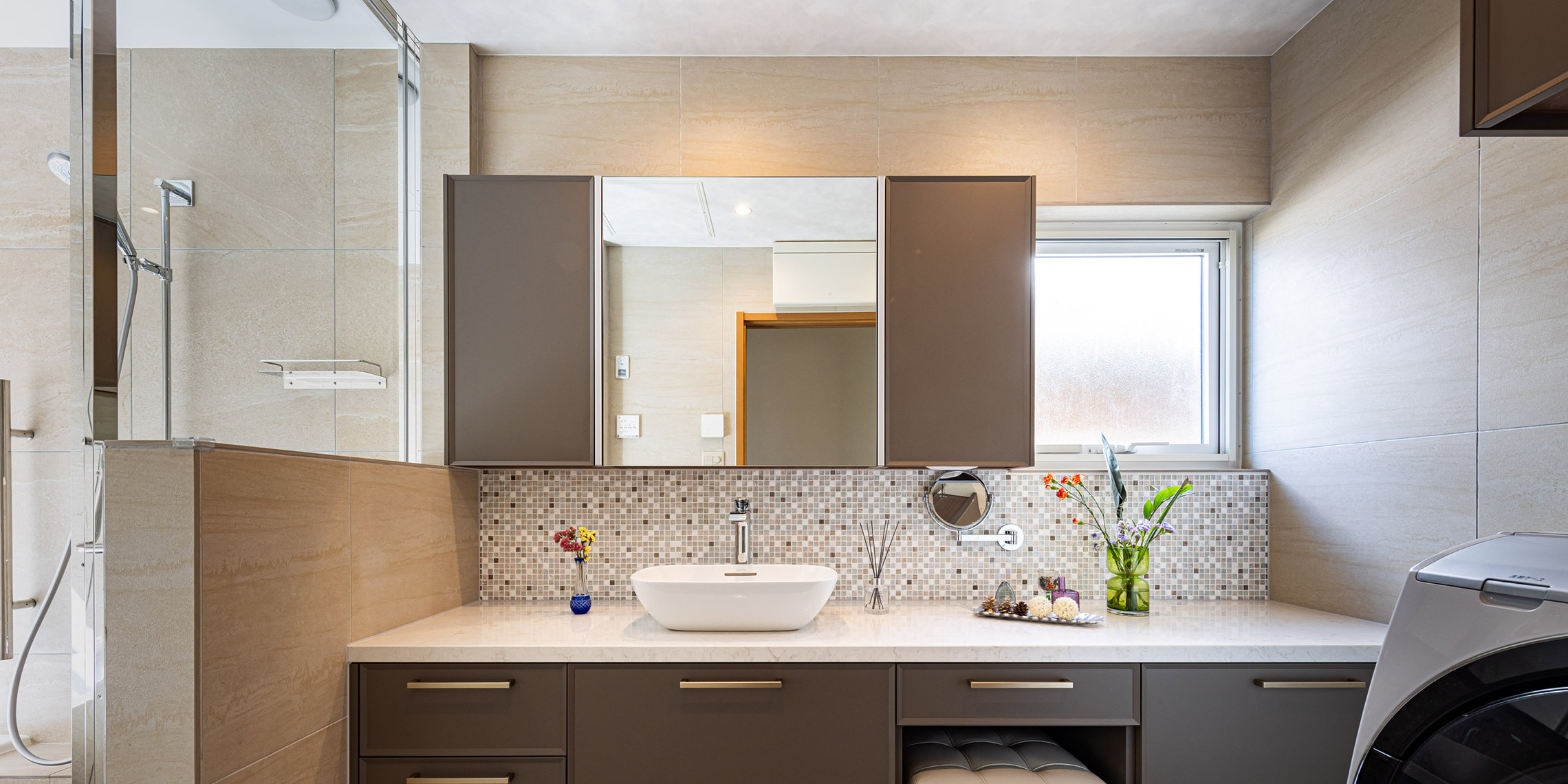 浴室の壁はアルティカ ベージュ内用60×60サイズ、床はヌーベ内用60×60サイズで空間に落ち着きと統一感を与えています。洗面の壁はカレイド ベージュの大判60×120サイズでラグジュアリーに。