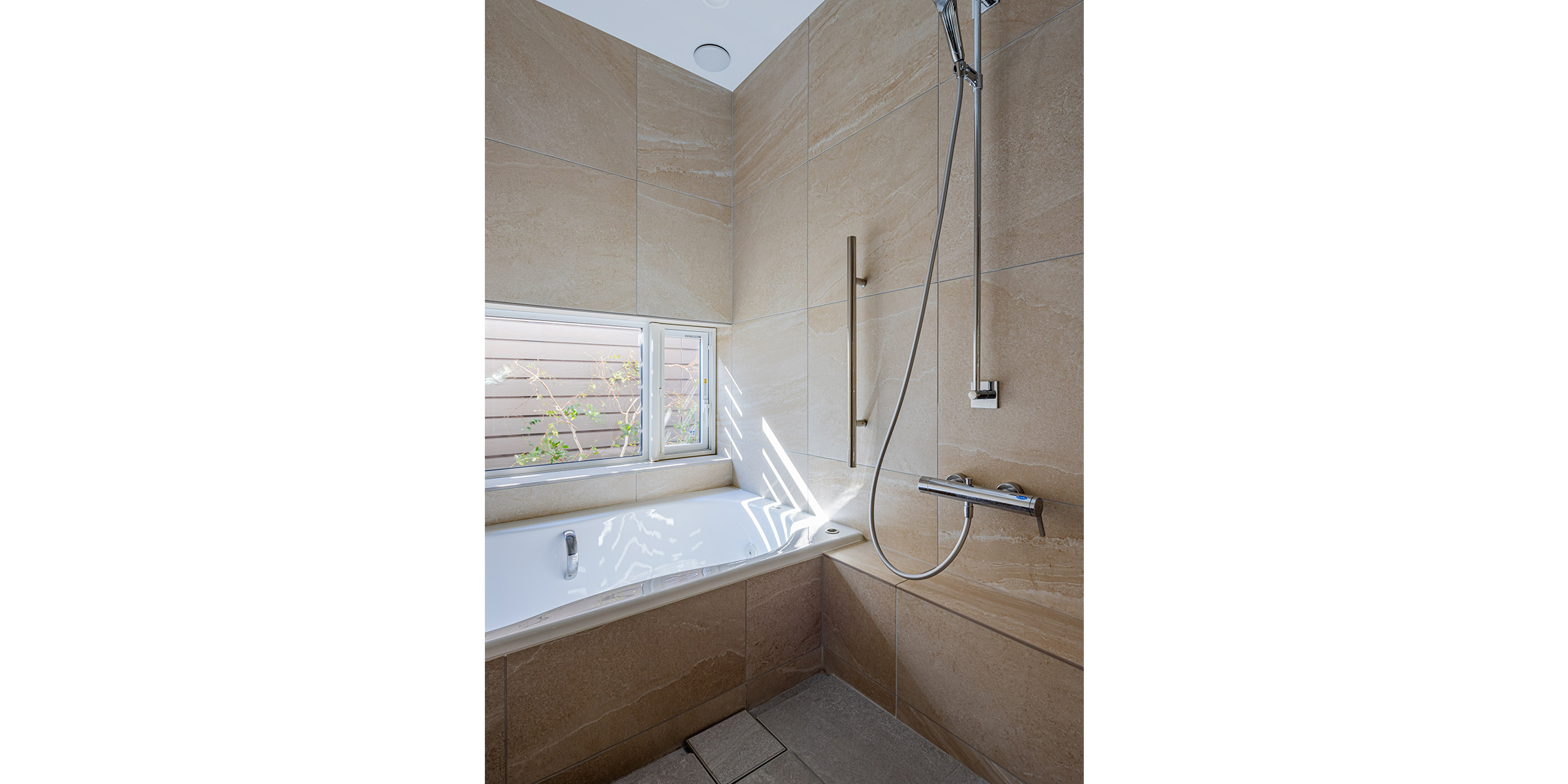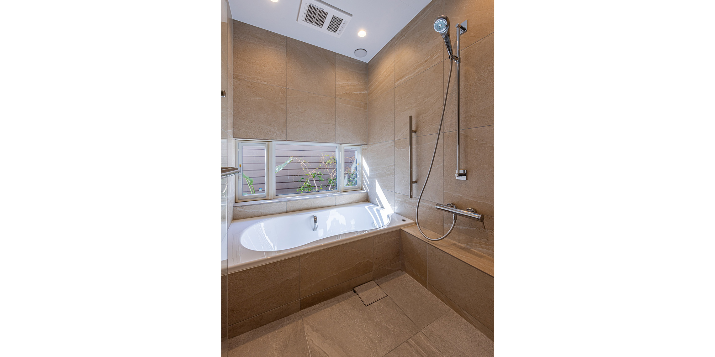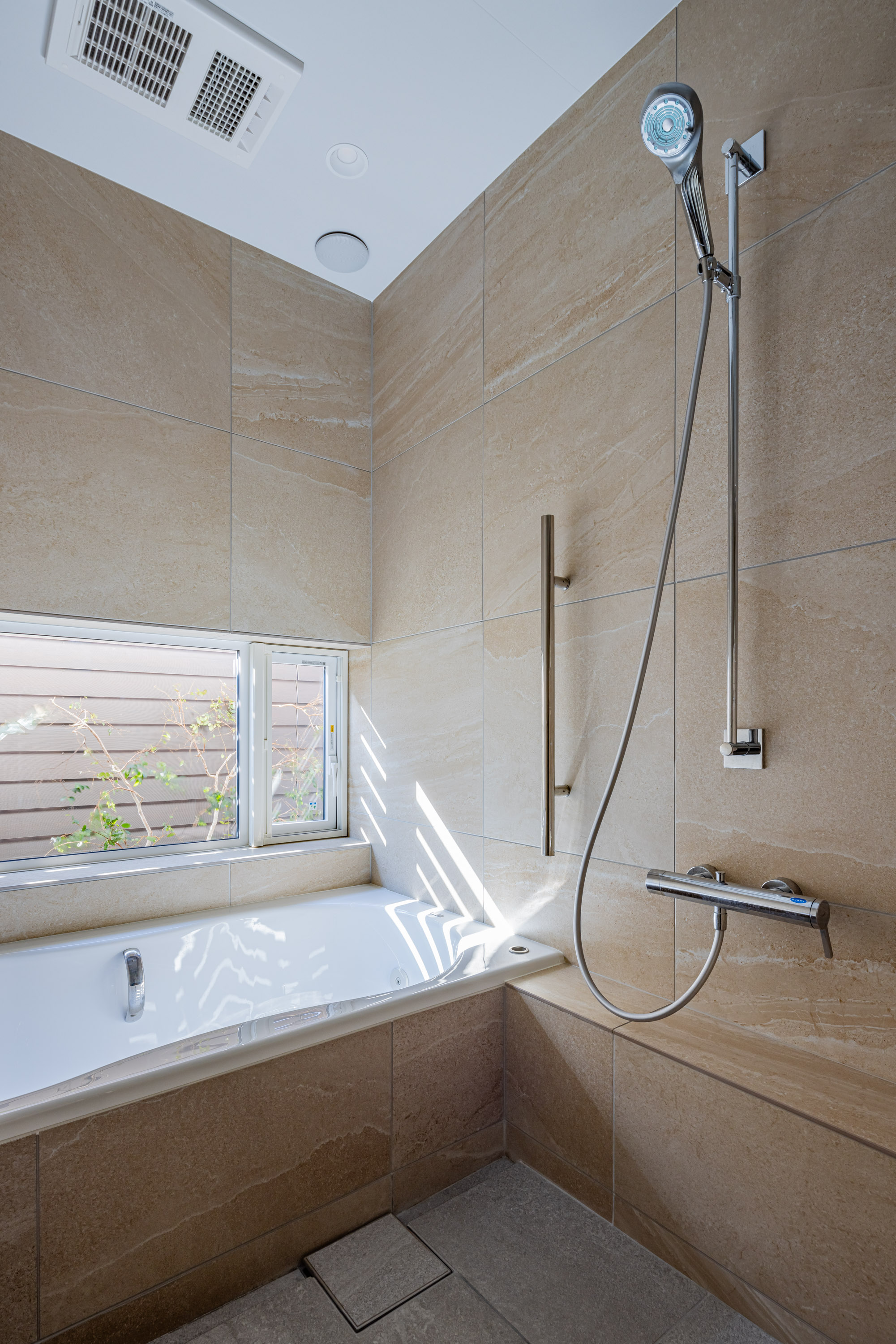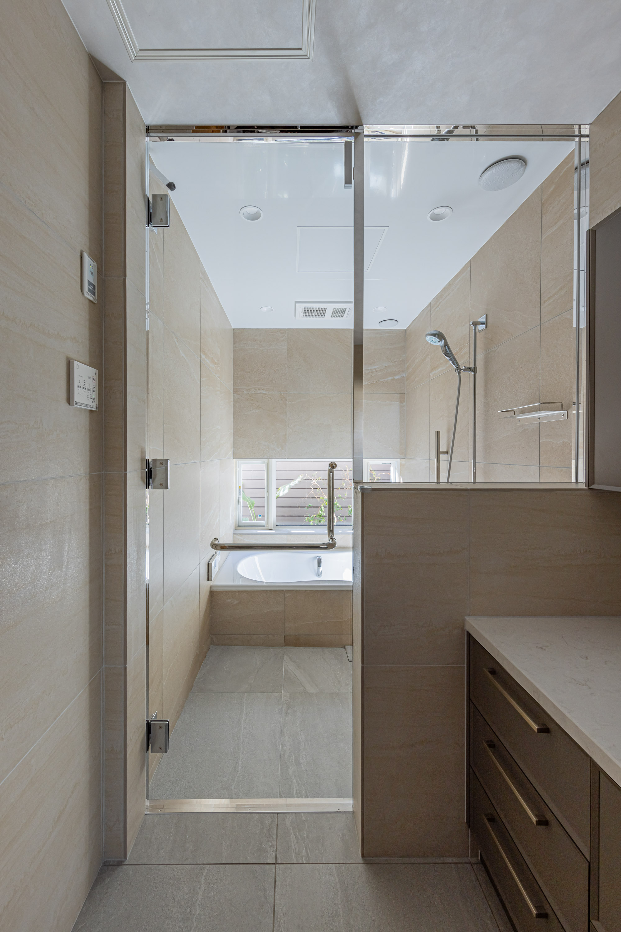 浴室の壁はアルティカ ベージュ内用60×60サイズ、床はヌーベ内用60×60サイズで空間に落ち着きと統一感を与えています。洗面の壁はカレイド ベージュの大判60×120サイズでラグジュアリーに。